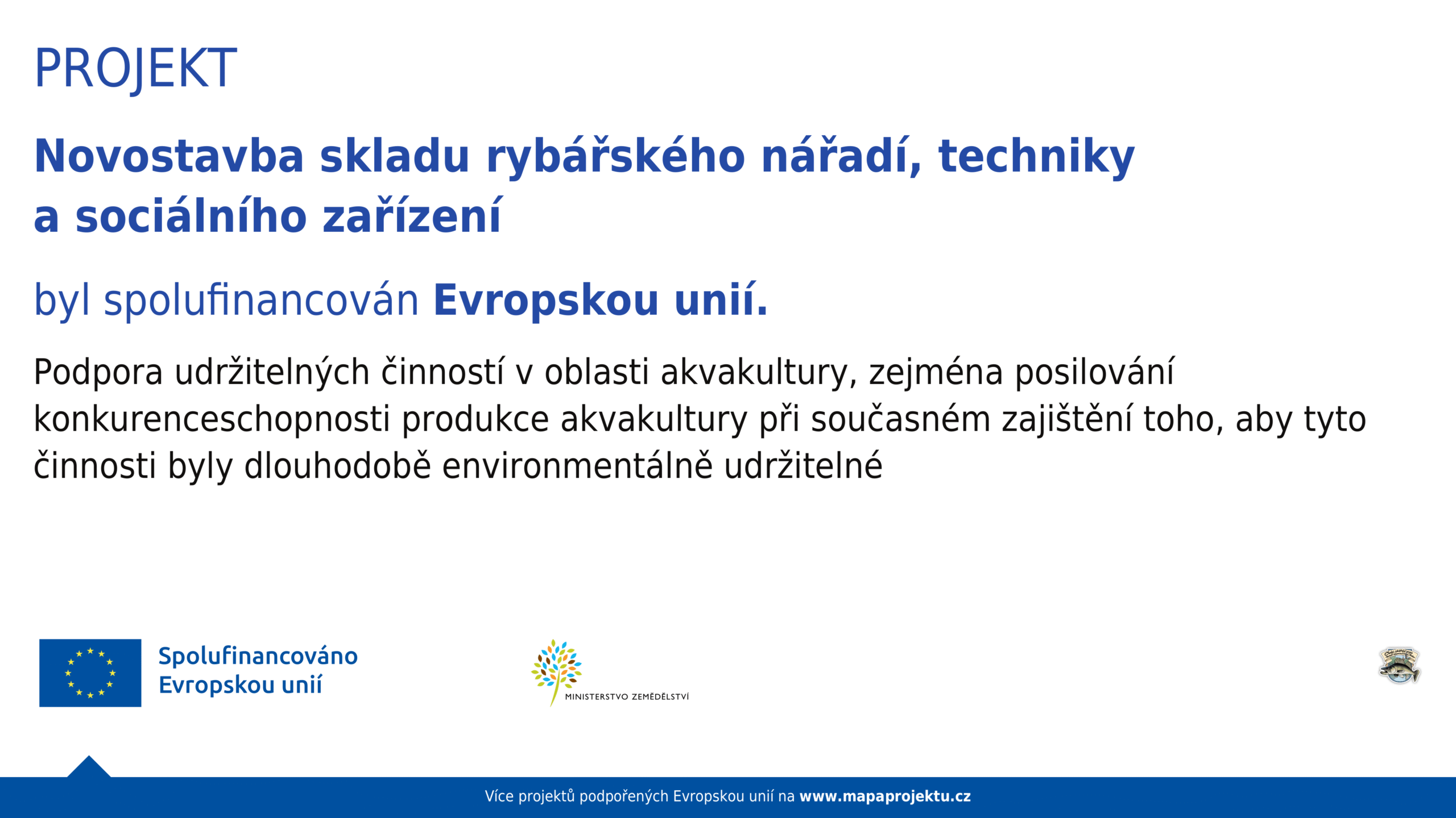 V roce 2025 se nám podařilo dokončit projekt Novostavba skladu rybářského nářadí, techniky a sociálního zařízení z OPR s náklady v celkové výši 2 900 000,- Kč.